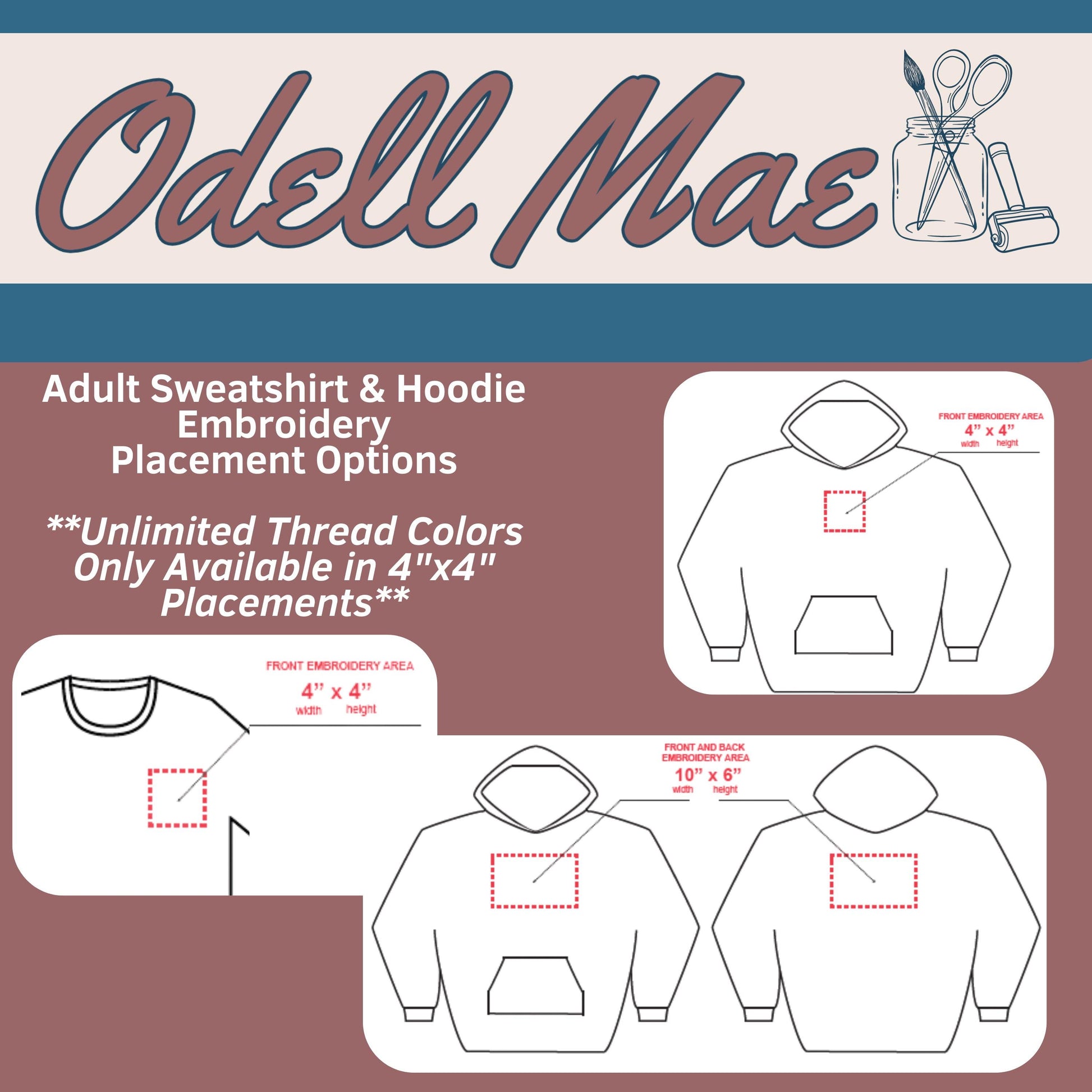 3. CHOOSE EMBROIDERY PLACEMENT - There are 5 embroidery placement options, and 2 design area size options (your design can be any size within these maximums)